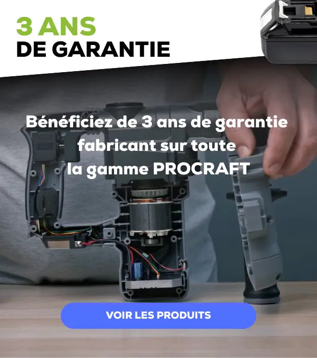 Tous les outils PROCRAFT respectent les standards européens de sécurité et de qualité. En plus, PROCRAFT propose jusqu’à 3 ans de garantie fabricant.