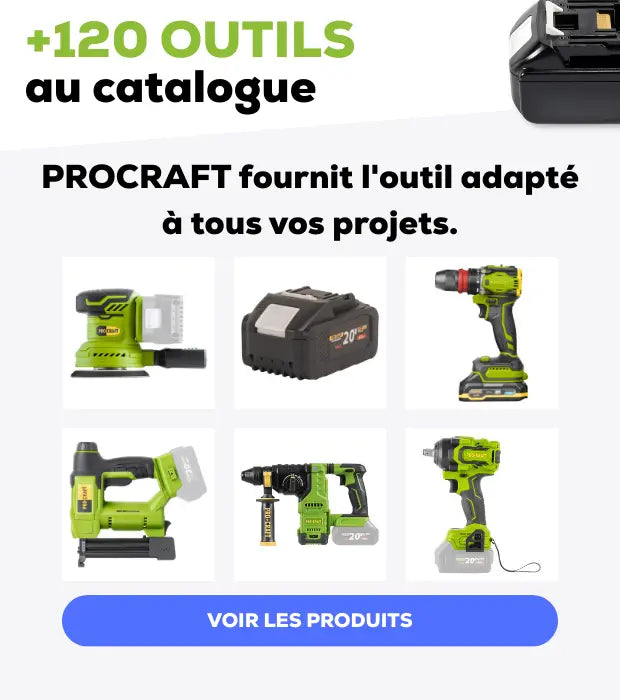 Grâce à notre sélecteur de produits ou via les catégories, vous trouvez rapidement les outils PROCRAFT adaptés à vos travaux.