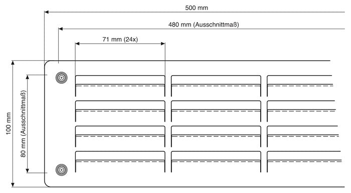 Épaisseur 1,5 mm - Passage d'air 207 cm² - Lamelles pliées vers l'arrière 71 mm - Dimensions extérieures 500 x 100 mm - Dimensions extérieures de coupe 480 x 80 mm