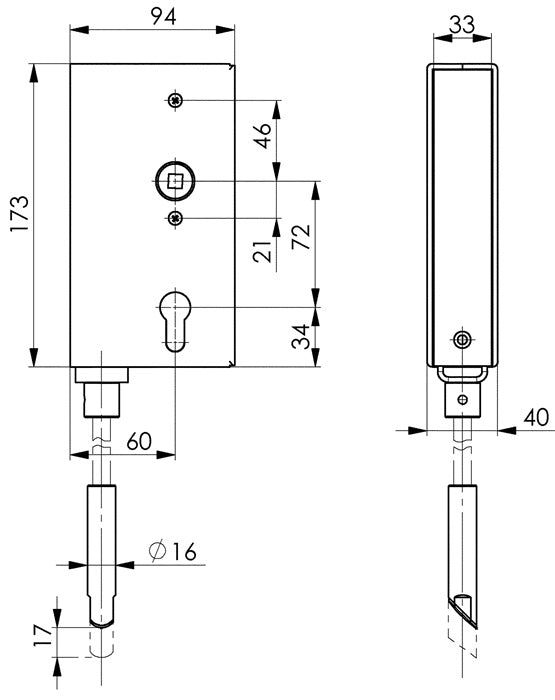 avec serrure galvanisée (142V) - pour verrouillage vers le bas - nu - sans pêne dormant ni pêne demi-tour - utilisable à droite et à gauche - prévu pour cylindre profilé ou kit d'adaptation Buntbart - avec changement - dimension de la broche 60 mm - distance 72 mm - carré 8 mm - 1 tour - accessoires : - 2 rosettes de poignée 18 mm - 4 vis, acier inoxydable - 1 boulon de pêne réglable en acier inoxydable - 1 pièce d'adaptation pour tige filetée M10