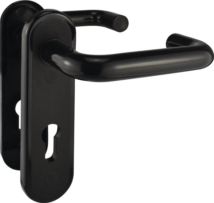 Garniture de béquille adaptée aux serrures de portes métalliques légères -Enlèvement 72 mm - Pour épaisseur de porte 40-57 mm - - Couleur noire - Caches inclus - Béquille montée sur pivot fixe