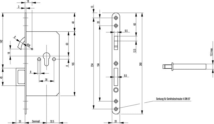 BKS serrure à pêne circulaire 0353 ( 3000250761 ) pêne circulaire / poignée à ressort 20 x 260 mm