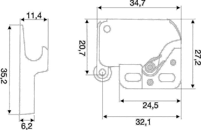 à visser - réglable par trou oblong - contrepartie en plastique blanc incluse - loqueteau en acier nickelé - 24,5/34,7x27,2mm