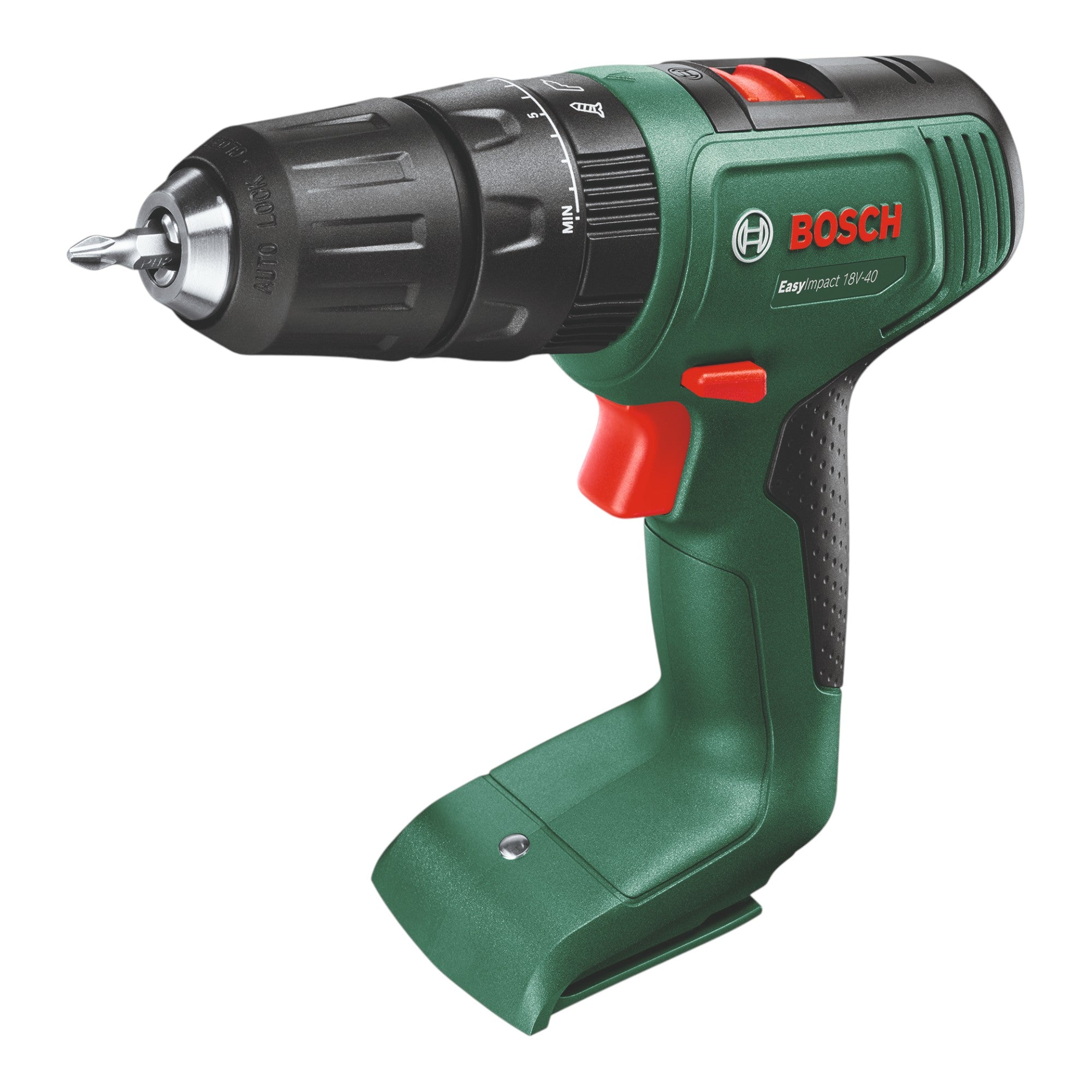 Bosch EasyImpact 18V-40 ist eine vielseitige Akku Schlagbohrschrauber zum Schrauben, Bohren in Holz, Metall und Kunststoff sowie zum Schlagbohren in Mauerwerk. Das 2-Gang-Getriebe und 20 Drehmomentstufen sorgen für die passende Leistung und Drehzahl in jeder Anwendung. Das einhülsige 13-mm-Schnellspannbohrfutter ermöglicht einen einfachen Wechsel von Bohrern und Schrauberbits. Dank schlankem, ergonomischem Design und integriertem LED-Licht ist ein komfortables Arbeiten auch in schlecht beleuchteten Bereichen möglich. Das Gerät ist Teil der 18V POWER FOR ALL ALLIANCE, sodass ein Akku in vielen Geräten verschiedener Marken eingesetzt werden kann.