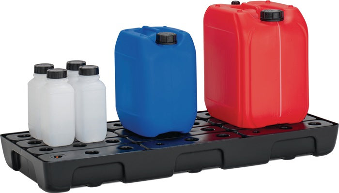 pour petits récipients - pour le stockage sûr et conforme aux prescriptions de liquides dangereux pour la nappe phréatique des catégories GHS 1-4 - en polyéthylène HD - très résistant aux bases, huiles et acides - avec grille en PE - empilable - conçu pour différentes profondeurs de rayonnage - avec homologation DIBT n° Z-40.22-601