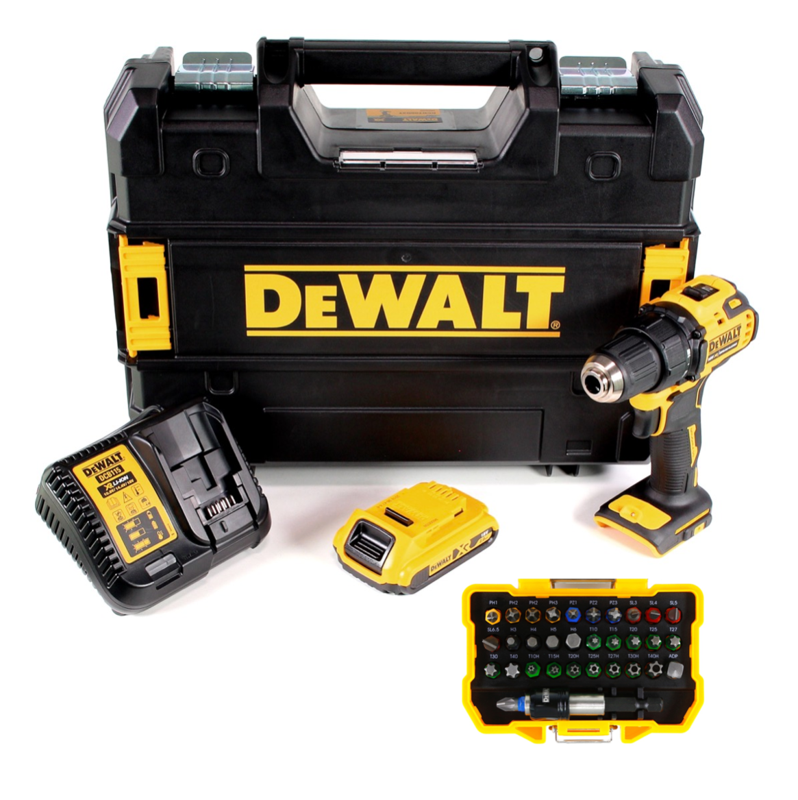 Perceuse-visseuse sans fil DeWalt DCD 708 D1T 18V 65Nm sans balais + 1x batterie 2,0Ah + chargeur + jeu d'embouts 32 pièces. + TSTAK