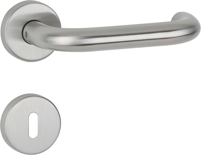 Acier inoxydable mat - tige carrée de 8 mm - testé selon EN 1906 classe 3 - convient pour DIN gauche / droite - béquilles de porte logées librement dans une sous-construction en plastique - système de rosaces facile à monter grâce au prémontage intelligent des rosaces à clipser et des béquilles - ressort de maintien en position haute agissant des deux côtés, utilisable à droite et à gauche - montage séparé des rosaces et des paires de béquilles - convient pour épaisseur de porte 38-45 mm