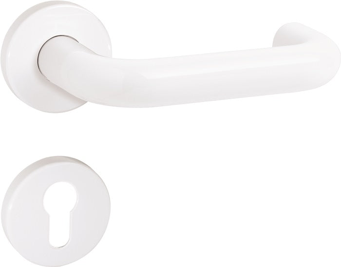en technique R avec rosaces selon DIN 18255 et DIN EN 1906 en polyamide, surface brillante, comprenant : Béquilles de porte en forme de U en polyamide avec noyau en acier continu jusqu'à l'extrémité de la béquille, teintées dans la masse, diamètre 23 mm, avec guidage de l'embout et rainure d'encliquetage, montage par simple encliquetage des béquilles de porte dans les parties inférieures prémontées sur la porte. L'encliquetage peut être libéré à l'aide d'une clé de démontage. La béquille répond aux exigences des normes DIN EN 179 et DIN 18040. Sous-construction de la rosace en composite plastique/inox, utilisable à gauche et à droite. Palier à rotation fixe de la béquille avec verrouillage circulaire à enclenchement automatique et palier de 5 mm comme palier lisse sans entretien avec zone de compensation élastique et deuxième palier dans le col de la béquille. Vissage invisible, sans risque de desserrage, avec combinaison de vis M4 et de vis à douille ainsi que de tourillons d'appui. Cache de rosace, rond, en polyamide teinté dans la masse, diamètre 55 mm, hauteur 13 mm, bombé, épaisseur de paroi 1,5 mm. Perforation PZ Conçu et testé pour le secteur public, catégorie d'utilisateurs selon DIN EN 1906 - classe 4 Garniture coupe-feu avec tige carrée de 9 mm, selon DIN 18273 - Garniture à béquilles - Longueur de la béquille 150 mm