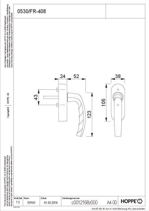 • 1x poignée de fenêtre HOPPE Atlanta 0530/FR-408 aluminium F9 / couleur acier