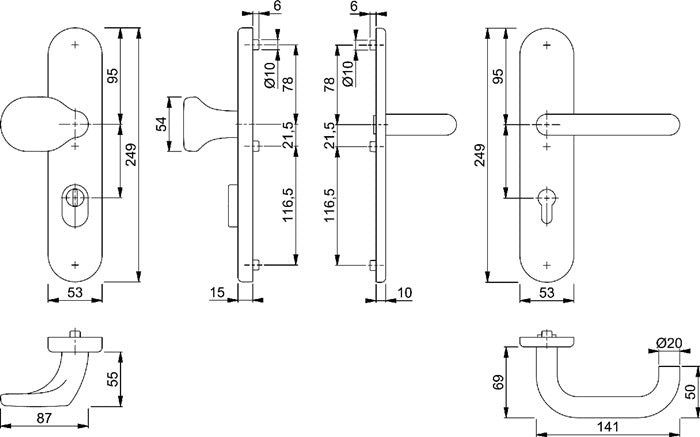 pour portes extérieures - testé selon DIN 18257 et DIN 18273 - poignée de porte fixe/rotative - palier lisse sans entretien - assemblage par goupilles profilées - sous-construction : extérieur en acier, intérieur en zamak/acier, ergot de support - fixation invisible, continue - perforation PZ - carré 9 mm - DIN utilisable à gauche / à droite - distance 72 mm