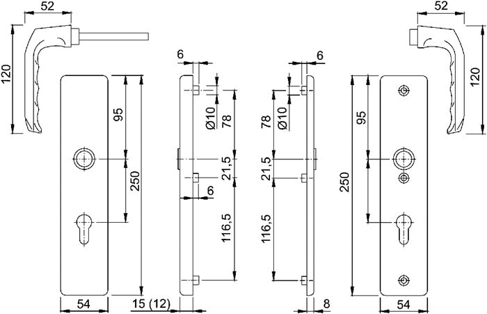 Garniture de béquille pour portes de fermeture - avec insert partiel en acier comme protection contre le perçage - hauteur de bord de la plaque de bouton : 12 mm - avec triple vissage visible - avec ergots en acier - perforation PZ - DIN gauche / droite - classe de résistance ES 0