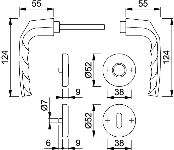 Garniture de rosace pour porte intérieure - Sous-construction en plastique avec ergots de soutien - Assemblage par goupilles profilées - Vissage caché traversant avec vis autotaraudeuses - Garniture à béquilles - Sens d'ouverture DIN gauche / droite