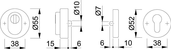 Paire de rosaces-clés de protection en acier inoxydable pour portes extérieures - Sous-construction : extérieur en zamak, intérieur en acier, ergots de soutien - Fixation : invisible, traversante, vis filetées M5 - Épaisseur 15 mm - Ø 55 mm - Perçage PZ - pour épaisseur de porte 57-62 mm + 67-72 mm Variante avec cache-cylindre : acier, pour longueur de cylindre en saillie 10-18 mm