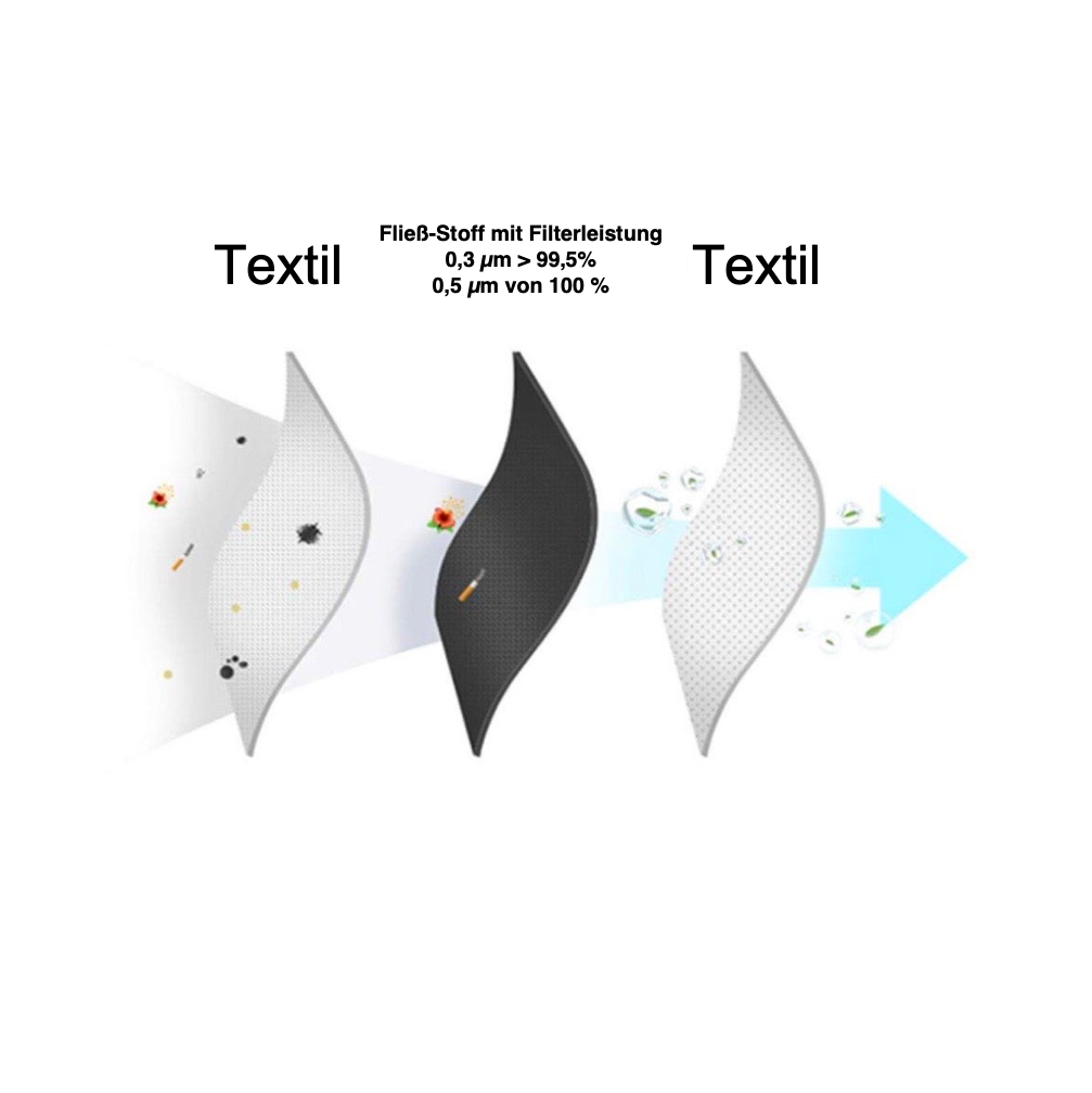 Le masque respiratoire est léger et très confortable à porter. Le tissu fluide s'adapte parfaitement à la forme de la tête et se scelle ainsi très bien. En plus de la performance exceptionnelle du filtre de 99,5% pour des tailles de particules de 0,3 µm et 100% à 0,5 µm, le masque respiratoire a également une propriété positive avec les agents pathogènes biologiques. Cela empêche au mieux l'infection. Avec le masque, vous vous protégez et protégez les gens qui vous entourent. Les dernières recherches ont montré que les masques avec un filtre externe laissent à nouveau les bactéries respirer, cela ne peut pas arriver avec ce masque. Le masque est utilisé pour filtrer l'air que nous respirons en arrêtant les virus et les bactéries. La qualité du matériau du masque respiratoire est comparable à celle d'un masque FFP3. Le masque lui-même n'a pas une telle certification FFP, mais est actuellement livré à tous les hôpitaux et pharmacies qui le connaissent en très grand nombre depuis des semaines. Le protège-dents est un élément important de votre protection personnelle contre les infections. Veuillez vous référer aux informations fournies par le RKI (Robert Koch Institute) et les autorités sanitaires.