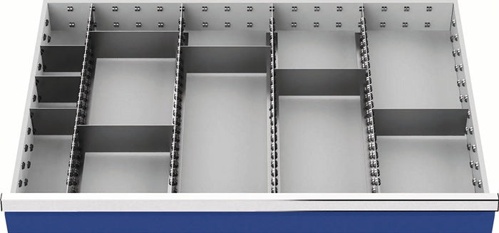 Compartimentage métallique pour hauteur de façade 200 mm - pour dimensions intérieures de tiroirs L 900 x P 600 mm - 4 séparations longitudinales - 8 séparations transversales