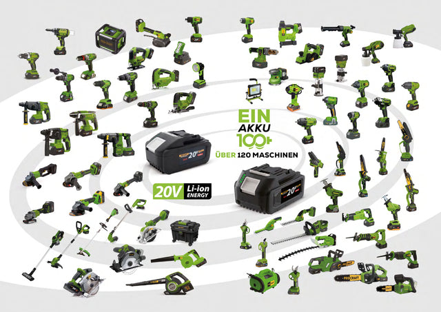 - Mit dem 20 Volt Akku können mehr als 120 Akku-Werkzeuge und Gartengeräte angetrieben werden.