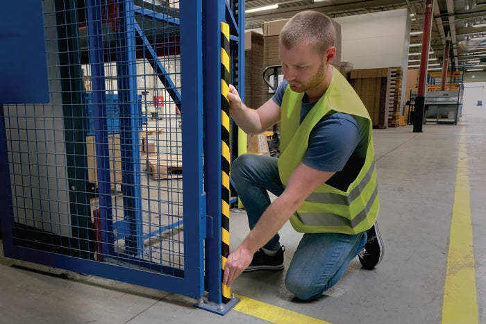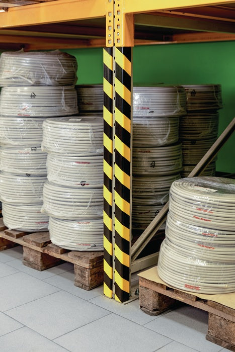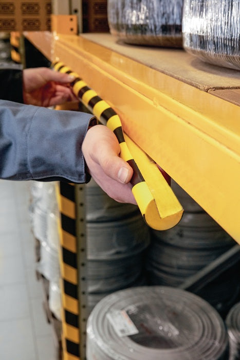 autocollant - profilé de protection d'angle flexible en mousse de polyuréthane - pour l'utilisation à l'intérieur - idéal pour l'utilisation dans la fabrication, l'expédition et l'entrepôt, les caves, les cages d'escalier, les garages, sur les murs et les poutres, les étagères et les armoires ainsi que sur les machines, les chariots de stockage, etc. - pour protéger et marquer les zones dangereuses, atténue les blessures par choc - les profilés peuvent être raccourcis à la longueur souhaitée à l'aide d'un cutter bien aiguisé - teintes conformes à la norme ASR A1.3 similaires à RAL 1003/9004 (jaune de sécurité/noir de sécurité) - test d'inflammabilité selon DIN EN 13501-1 classe E - résistance à la température de -30 °C à + 70 °C