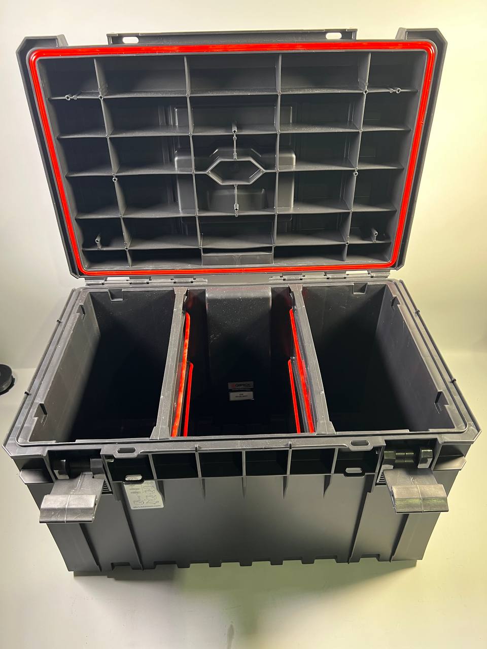 Avec une capacité impressionnante de 52 litres, la mallette à outils Qbrick System ONE 450 2.0 Basic offre suffisamment de place pour les gros outils électriques et manuels. A l'intérieur, deux compartiments réglables assurent une organisation optimale et une bonne visibilité. Grâce à son joint flexible, la mallette est entièrement protégée contre la poussière et l'eau conformément à la norme IP66, ce qui la rend idéale pour une utilisation dans des environnements de travail exigeants. Le couvercle Basic est doté d'une fente de découpe fonctionnelle avec maille, qui offre des possibilités d'application supplémentaires. La structure renforcée du couvercle et du corps garantit une capacité de charge élevée allant jusqu'à 50 kg et résiste à une pression de 120 kg, ce qui permet d'utiliser la mallette comme une plate-forme de travail robuste. La version 2.0 de la ligne de produits ONE se caractérise par un design encore plus solide et offre des possibilités d'extension flexibles grâce à l'adaptation aux inserts filetés M8, afin de répondre aux besoins individuels de l'utilisateur.