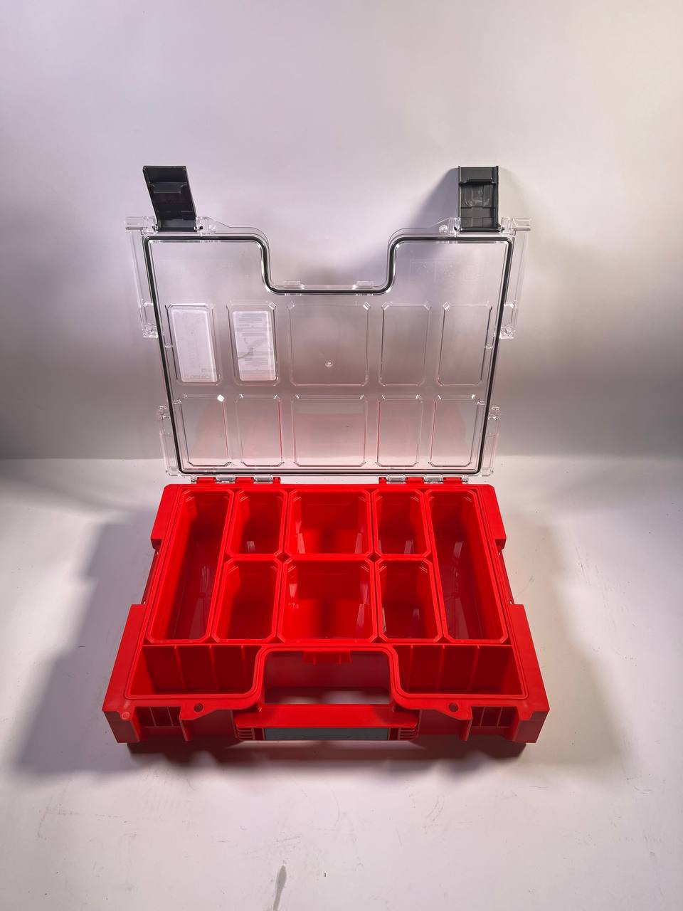 RED ULTRA HD est une édition spéciale de produits Qbrick System PRO en plastique ultra-résistant, qui se caractérise par une résistance exceptionnelle aux dommages mécaniques. Les tests d'impact effectués confirment sa durabilité exceptionnelle, même dans des conditions inférieures à 0 C. Qbrick System PRO Organizer 300 est le plus grand modèle d'organiseur de la ligne PRO. En plus des solutions connues des autres modèles, comme le système breveté Easy Access, un joint dans le couvercle, un couvercle en polycarbonate super solide, des connecteurs latéraux et des fermetures frontales en polyamide et une poignée solide, il offre un corps plus profond, ce qui le rend plus compact. Il est équipé de 8 seaux de tailles différentes, dont deux seaux longs pour le rangement de longs accessoires d'atelier.