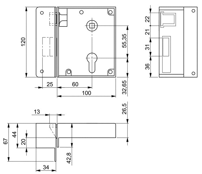 modèle lourd - vers l'intérieur - galvanisé - pêne dormant - pêne non réversible - orienté pour un recouvrement de 17,5 - dimension de la broche 60 mm - fouillot 8 mm - largeur du coffre 100 mm - 2 tours - fermeture : PZW, avec changement - BB avec kit d'adaptation