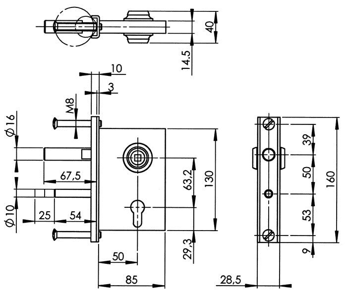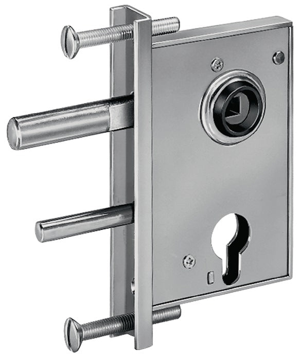 moyennement lourd - avec têtière en U - galvanisé - utilisable à droite et à gauche - pêne demi-tour en zamak, pêne dormant en acier - prévu pour cylindre profilé - dimension de la broche 50 mm - fouillot 8 mm- 2 tours - largeur du coffre 85 mm - BB avec kit d'adaptation avec changement - accessoires : - 2 rosettes de béquille 18 mm