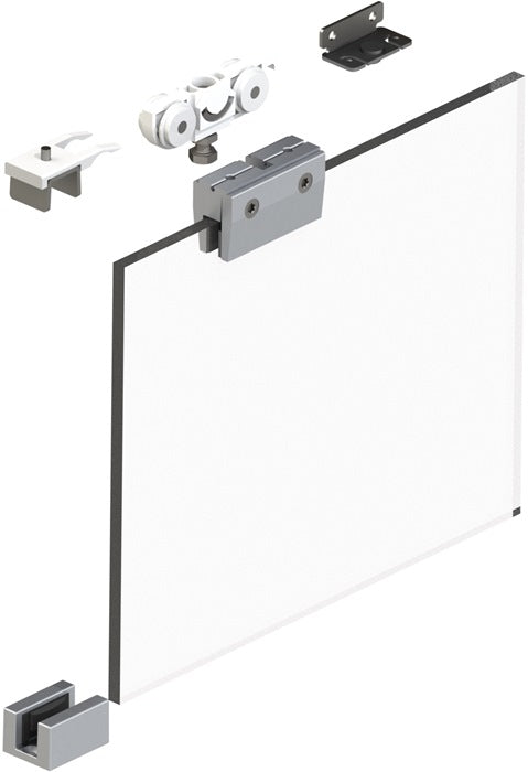 Kit complet - pour portes coulissantes en verre à un vantail jusqu'à 50 kg de poids de vantail et 8 mm d'épaisseur de verre (ESG) - appareils de roulement avec roulement à billes et vis de support galvanisée, M8x35mm Contenu : 2x appareils de roulement HELM 73, 2x pinces à verre HELM 70 mm (8 mm ESG), 2x butées d'arrêt HELM 65 P, 1x HELM SmartGuide G (8-12,76 mm) testé selon DIN 1527:2013 200.000 cycles Rail de roulement 53/73 à commander séparément