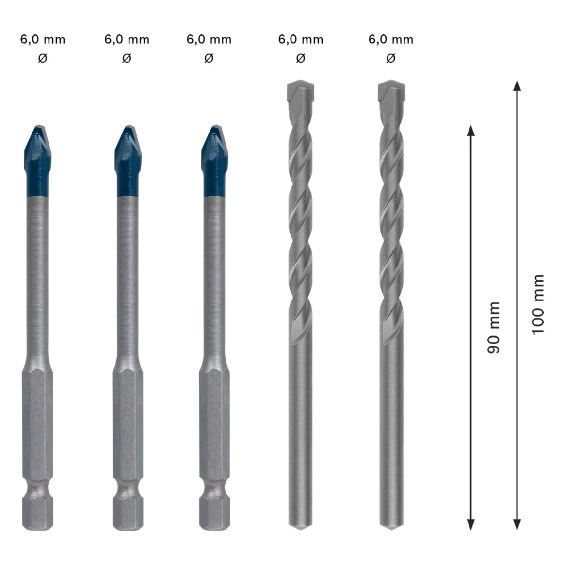 - 5x Bosch EXPERT HEX-9 Forets HardCeramic (3x 6,0 x 90 mm / 2x 6,0 x 100 mm)