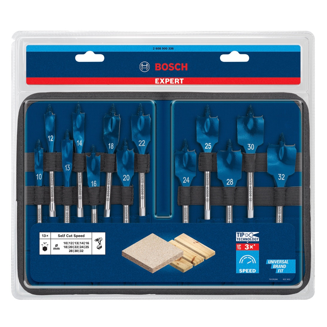 Bosch EXPERT SelfCut Speed Jeu de mèches à bois plates 10 - 32 mm 13 pièces ( 2608900336 ) pour le bois - Successeur de 2608587010