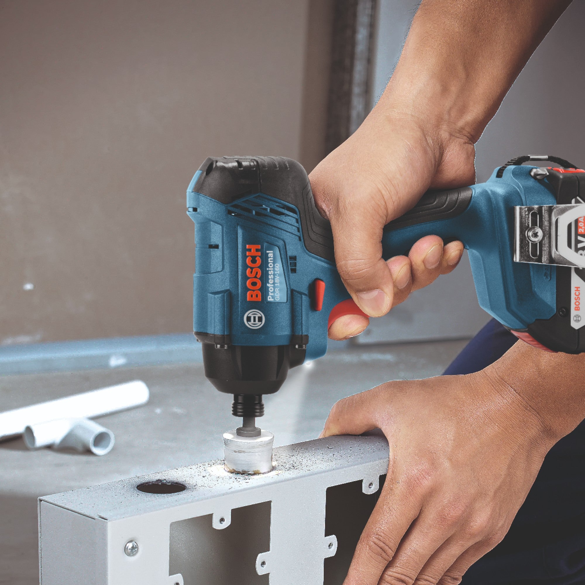 Le GDR 18V-160 est un pilote d’impact sans fil extrêmement puissant de Bosch de la série "Bosch Professional". En raison de son couple élevé, le tournevis permet d’avancer rapidement et, surtout, avec précision. Avec la fonction d'impact intégrée, même travailler avec des vis fortes en bois est un jeu d'enfant. Grâce à la LED intégrée, travailler dans des endroits sombres ne pose aucun problème: le clip de ceinture et le design ergonomique avec surface de préhension souple procurent un confort supplémentaire. Le poids relativement faible de 1,3 kg réduit la fatigue. Globalement, le dispositif offre une manipulation facile avec des performances élevées.