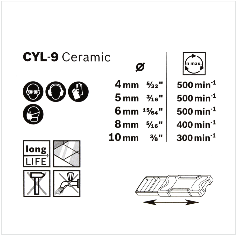 Le kit de 5 forets pour carrelage Bosch Pro CYL-9 Ceramic convient à tous les carrelages tendres à moyennement durs, à la porcelaine, à la céramique et au verre non trempé. Les forets sont fabriqués en carbure durable pour une longue durée de vie et une grande résistance. La tête du foret est également renforcée.