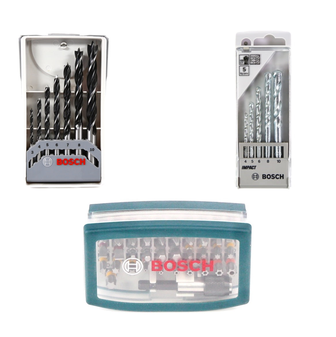 Bosch Professional GSB 18V-21 Perceuse-visseuse à percussion sans fil 18V 55Nm + Set de Forets à matériaux Bosch + Boîte d'Embouts de vissage Bosch + Assortiment de mèches hélicoïdales Bosch - sans Batterie, sans Chargeur