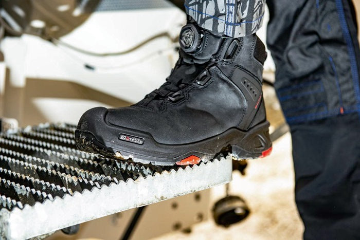 selon la norme DIN EN ISO 20345 - S3 SRC HRO - cuir pleine fleur, robuste, cuir de vachette LWG respirant - système de fermeture BOA® pour une ouverture et une fermeture faciles avec un réglage optimal du chaussant - système Heel-Safety - embout flexible en acier Baak® - élément de couplage en H intégré pour une flexion adaptée au pied - semelle intermédiaire antiperforation non métallique flexible - système Baak® go&relax - semelle intérieure Baak® ESD Softstep+ - résiste brièvement à une température de 300°C - antidérapante, résistant à de nombreux acides et bases, résistant aux coupures - selon DGUV 112-191 - largeur 11 sur demande également à partir de la taille. 38 et jusqu'à la taille 48