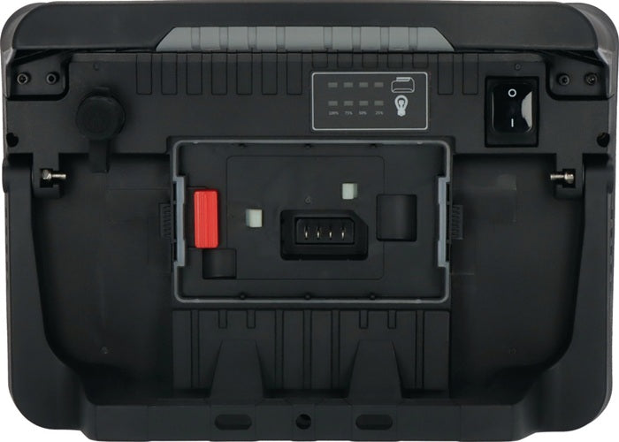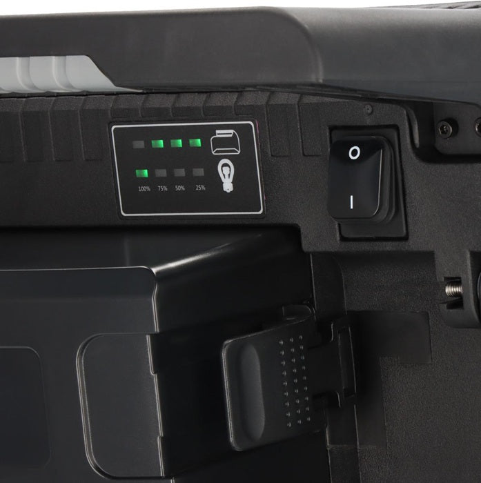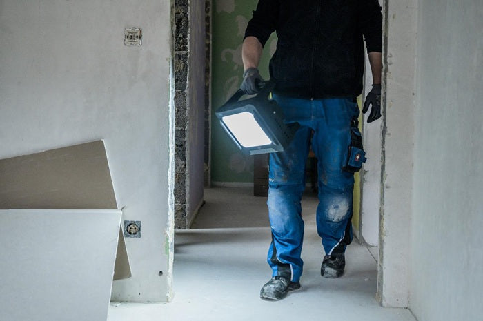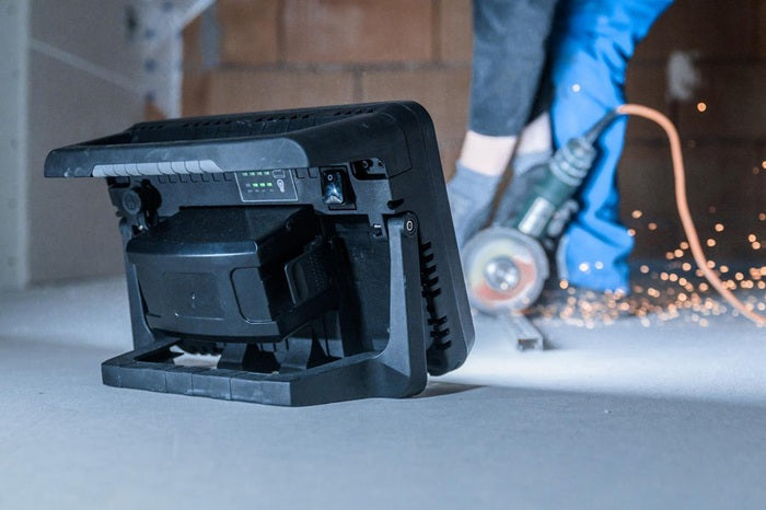compatible avec différentes batteries 18V (différentes classes Ah) des fabricants de powertools Bosch Professional, Makita, Dewalt, Milwaukee, Metabo CAS - plus de flexibilité grâce à la technique hybride : fonctionnement sur batterie et sur secteur possible, commutation automatique du secteur sur la batterie en cas de panne de courant - connexion par câble plug-in - interrupteur avec fonction : 100% - 75% - 50% - 25% de lumière - durée d'éclairage en fonction de la batterie utilisée, env. 12 min/1 Ah pour une puissance lumineuse de 100 % - affichage de l'état de l'accu - les accus sont protégés contre la décharge profonde et la surchauffe - capot de protection de l'accu amovible - projecteur LED avec protection anti-basculement, protège la lentille et le boîtier du projecteur - boîtier stable - poignée ergonomique - interrupteur marche/arrêt - montage sur pied possible