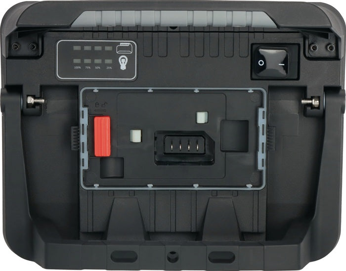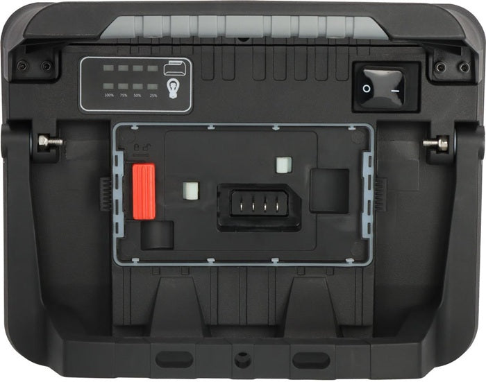 compatible avec différentes batteries 18V (différentes classes Ah) des fabricants de powertools Bosch Professional, Makita, Dewalt, Milwaukee, Metabo CAS, Festool, Flex - interrupteur avec fonction : 100% - 75% - 50% - 25% de lumière - durée d'éclairage en fonction de la batterie utilisée, env. 38 min/1 Ah à 100 % de puissance d'éclairage - Affichage de l'état de l'accu - Les accus sont protégés contre la décharge profonde et la surchauffe - Projecteur LED avec protection anti-basculement, protège la lentille et le boîtier du projecteur - Boîtier stable - à plat pour un éclairage de grande surface - Poignée ergonomique - Interrupteur marche/arrêt - Avec LED SMD puissantes - Possibilité de montage sur trépied