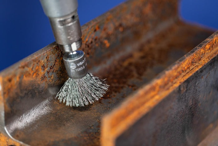 pour les travaux de brossage légers tels que l'ébavurage, le nettoyage et le dérouillage - le matériau de garnissage, le fil d'acier, dispose d'une grande résistance à la traction et à la flexion alternée - garantit une usure optimale du fil ainsi qu'une durée de vie élevée, même dans les applications de brossage extrêmes. Le fil d'acier résiste à des températures allant jusqu'à 300 °C. Ø de la tige 6 mm