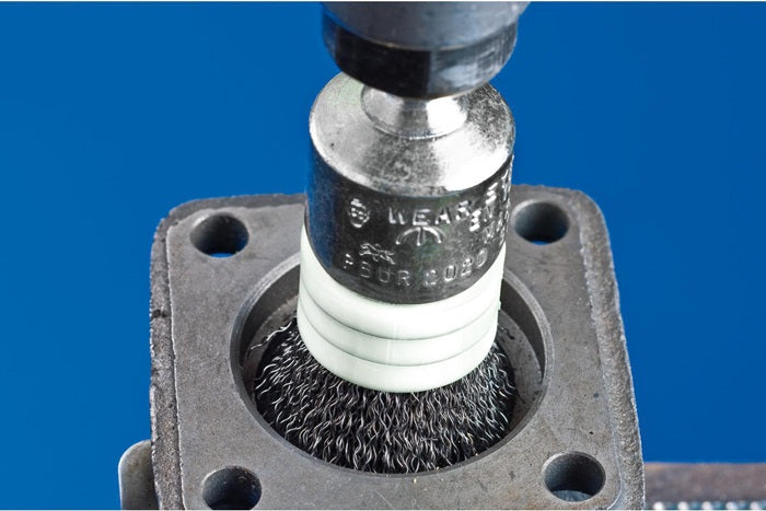 - Les avantages : Lorsque la garniture est usinée jusqu'à la bague d'appui, celle-ci peut être retirée pour une utilisation ultérieure, sans que le comportement de brossage ne soit modifié. La bague d'appui permet d'éviter que les fils ne s'écartent latéralement. L'écartement et la flexibilité de la garniture de la brosse peuvent être réglés avec précision grâce à la bague d'appui. Atteinte optimale des endroits difficiles d'accès comme les creux et les trous. Longue durée de vie grâce à l'utilisation de fils spéciaux PFERD. Produit des surfaces fines.