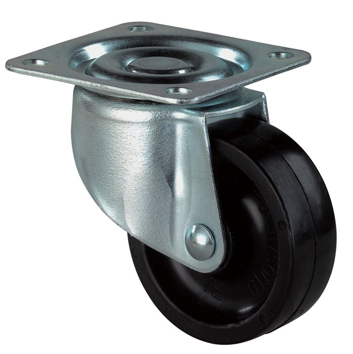 Boîtier en tôle d'acier, zingué chromaté - couronne à billes à une rangée dans la chape - axe de roue riveté - palier lisse - avec fixation par plaque - roue en plastique (noir)