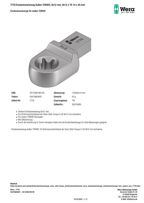 Clé à douille Wera 7776 ( 8000377440 ) ouverture de clé TX 14 9 x 12 mm