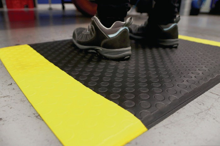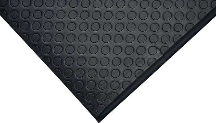 Tapis de travail ergonomique à une couche (en mousse) avec surface à picots antidérapante - idéal pour les postes de travail à sollicitation faible à moyenne - convient pour les zones intérieures sèches - a un effet isolant contre le froid sur les sols en béton - les bords biseautés du tapis réduisent les risques de trébuchement - avec bords jaunes pour une meilleure visibilité - protection contre l'incendie testée selon BS EN 13501-1 - épaisseur du tapis 9,5 mm