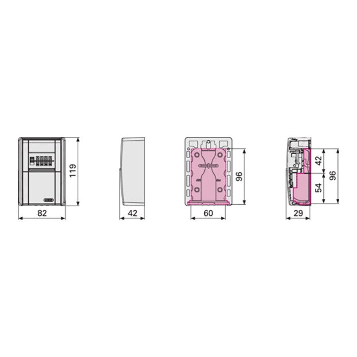 pour le stockage sécurisé de clés ou de petits objets de valeur pour les personnes autorisées - accès rapide et simple pour les groupes de personnes changeant fréquemment (par ex. artisans, service, vacanciers, location de véhicules, immeubles collectifs) - code numérique à 4 chiffres réglable individuellement - éclairage LED - capacité pour jusqu'à 14 cartes plastiques ou 20 clés - pour montage mural à l'intérieur ou à l'extérieur protégé - pile bouton CR2032 facile à remplacer, fournie