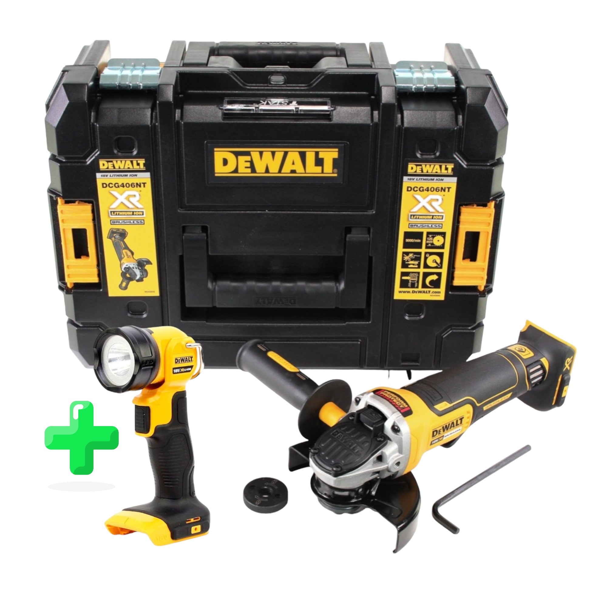 DeWalt DCG 406 NT Meuleuse d'angle sans fil 18V 125mm Brushless Solo + TSTAK + DeWalt DCL 040 18V XR Lampe rechargeable Li-Ion