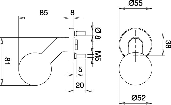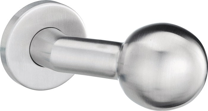 en acier inox - sur rosace ronde - tête sphérique coudée - Ø rosace 55 mm - hauteur 85 mm - épaisseur rosace 8 mm - distance trous de vis 38 mm