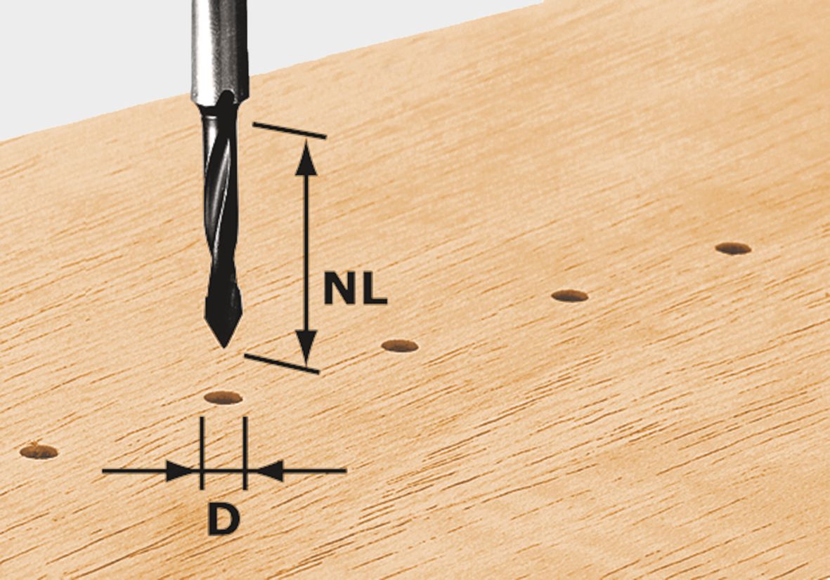 - Foret traversant pour rangées de trous, avec une longue pointe de perçage HW adaptée au fraisage de panneaux