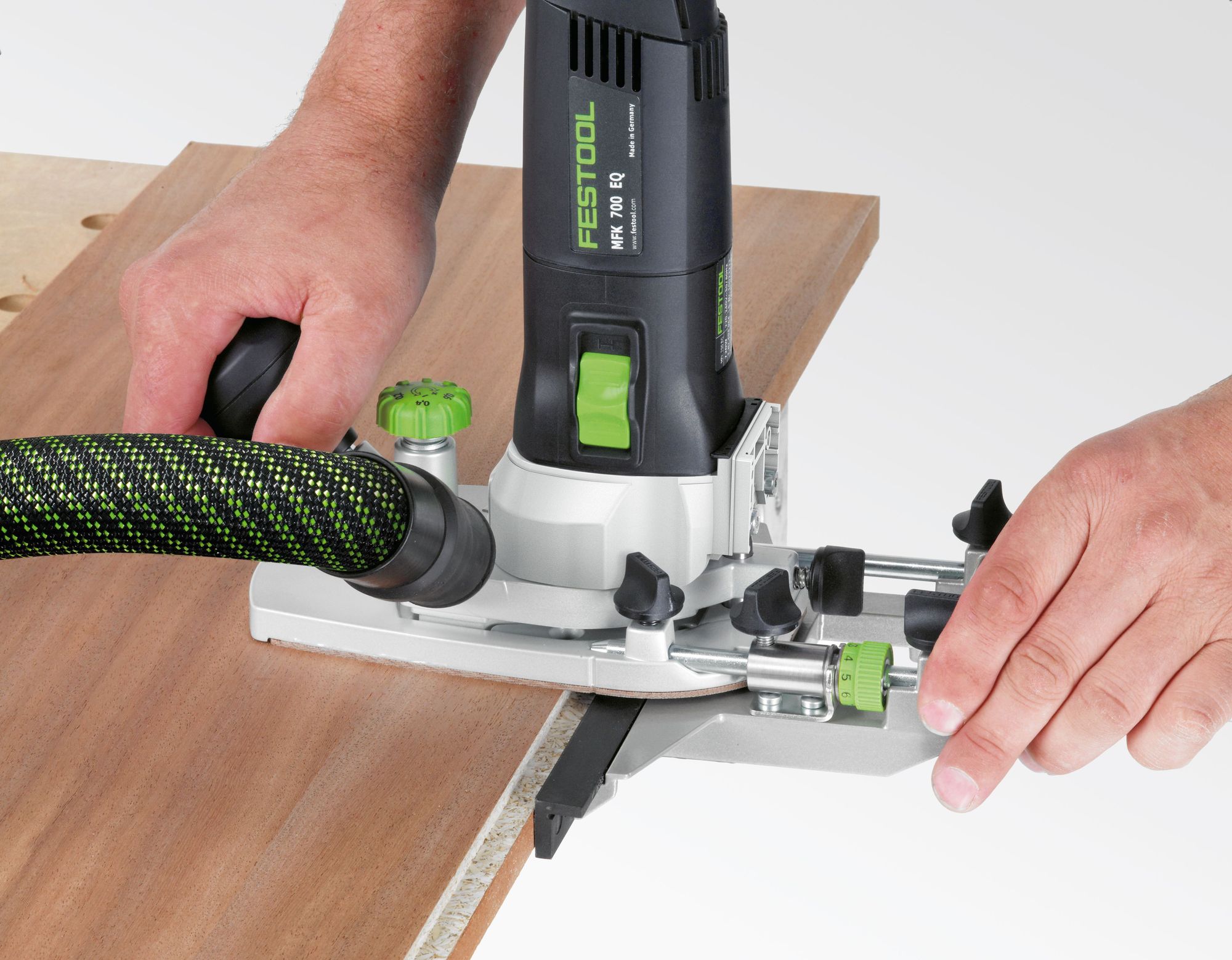 Butée latérale pour fraiser parallèlement au bord de la pièce. Durable et stable grâce au boîtier en magnésium moulé sous pression.