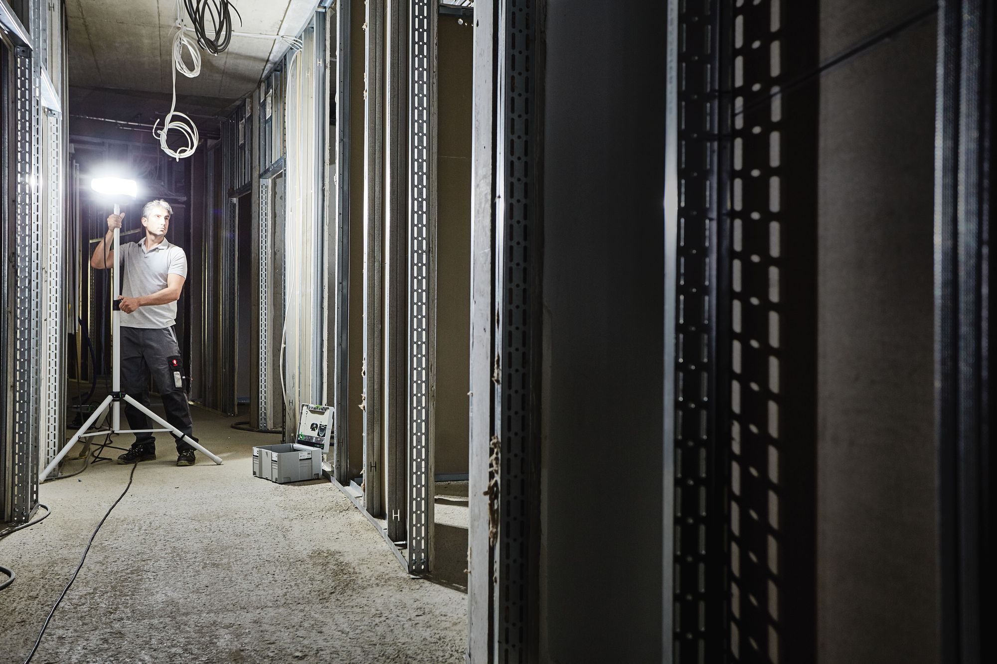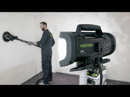 Le projecteur de chantier SYSLITE DUO de Festool convainc par sa disposition unique des LED pour un angle de diffusion de 180 ° et un éclairage homogène. La puissance lumineuse élevée de 8000 lumens permet d'obtenir un excellent éclairage sur une grande surface avec une couleur de lumière de 5000 K proche de la lumière du jour. Le projecteur de chantier Festool est robuste et durable et dispose en même temps d'une durée de vie allant jusqu'à 10000 heures. La Syslite DUO est résistante à la poussière, à l'eau, aux chutes et aux chocs. Toutes les surfaces de contact s'échauffent au maximum à 90 °C et la longueur de câble de 4,8 m assure une grande plage d'utilisation, ce qui se traduit par une manipulation parfaite lors des travaux. Le projecteur de chantier peut être fixé debout sur le sol ou sur des surfaces, sur le trépied Festool ou à volonté sur des crochets grâce à la possibilité de suspension à l'arrière. Festool est un fabricant leader d'outils électriques, une longue tradition et une grande qualité de produits caractérisent l'entreprise.
