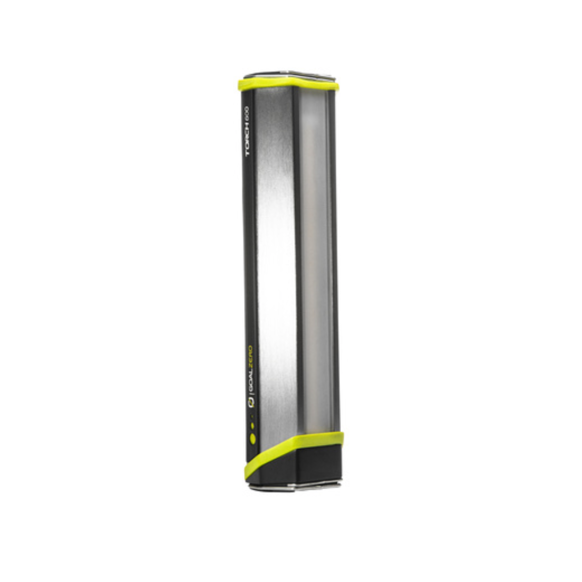 Cette Torch 500 de la maison Goal Zero est une lampe LED polyvalente dotée batterie rechargeable. Elle est également dotée d'un port USB et d'un panneau solaire qui vous permettent de la recharger en tout lieu. Elle dispose d'un système de protection contre la poussière et l'eau (protection IP67). C'est une lampe LED polyvalente d'une puissance d'éclairage de 500 lumens qui s'utilise à la fois  comme projecteur (face avant) et comme barre lumineuse (face latérale). Goal Zero est une entreprise qui a pour vocation de rehausser l'éclat du monde par la création des solutions d’énergie solaire portatives accessibles à tous et en tout temps.