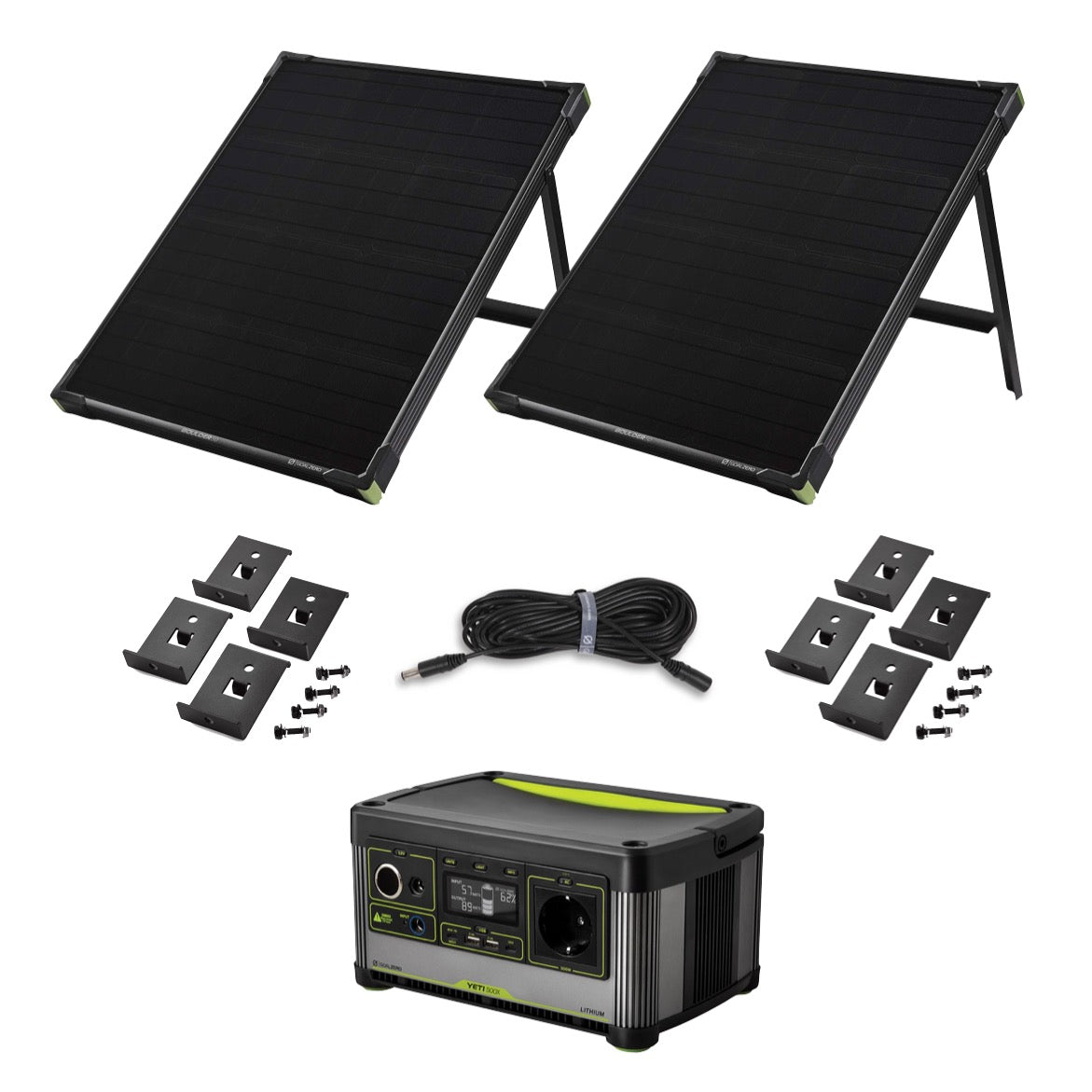 Centrale électrique portable Goal Zero Yeti 500X 5 - 230 V 46,8 Ah + 2x panneau solaire Boulder 50 22 V 50 W 3,5 A + rallonge de 9,1 m + 2x kit de montage Boulder