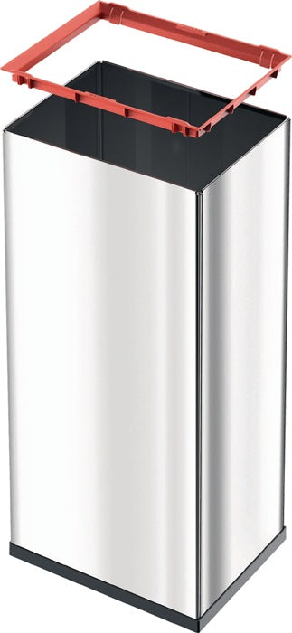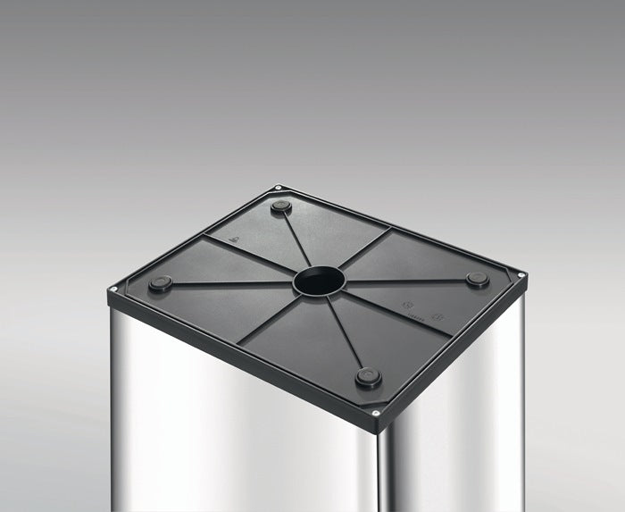 Contenu 52 l · Couvercle et fond en plastique noir très résistant · Boîtier en acier inoxydable · Le couvercle basculant en deux parties se ferme automatiquement, un verrouillage permet une ouverture complète du couvercle basculant · Avec cadre de serrage pour sac poubelle · Fond avec 4 anti- pieds coulissants · Livré démonté, facile à monter