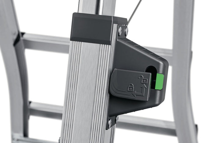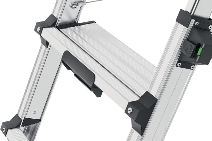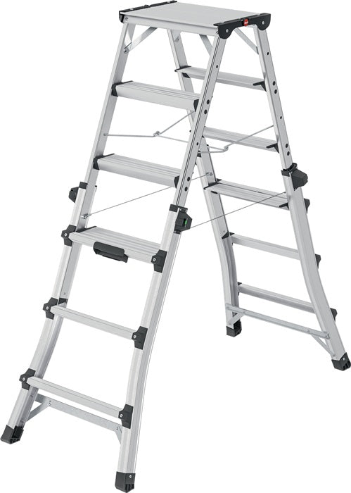 Aluminium - escabeau télescopique pour hauteurs de travail flexibles - montants de montée et d'appui réglables sur 2 x 4, 2 x 5 ou 2 x 6 marches - accessible des deux côtés - combinaison marches/échelons avec surface de marche antidérapante et striée - utilisable en escalier, réglage max. de l'escalier 430 mm - peu encombrant - charge totale max. 150 kg