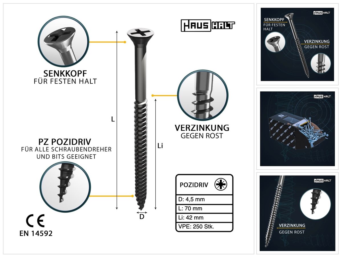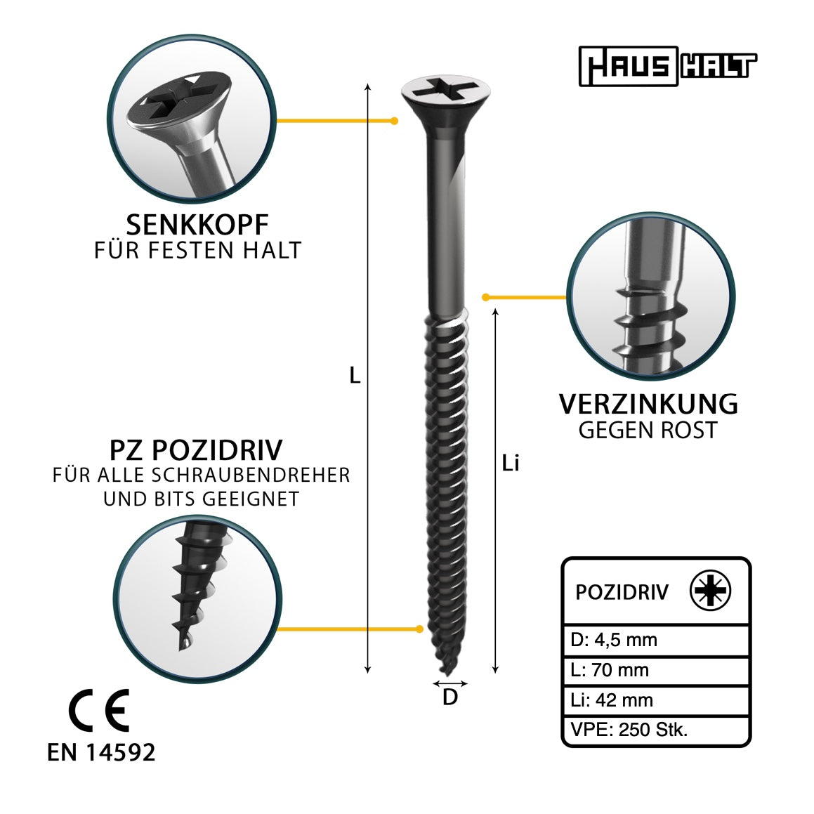 HausHalt Vis à bois universelle 4,5 x 70 mm PZ2 - 250 pièces (000051371177)